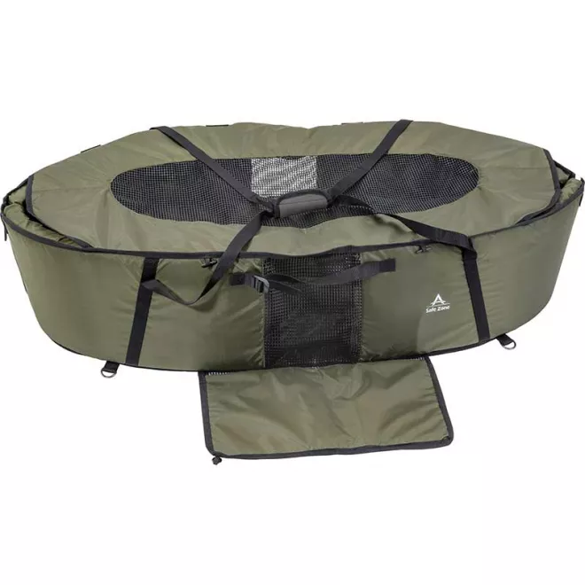 Hier kommt die Anaconda Safe Zone, eine transportfreundliche Abhakmatte mit einigen tollen Features. Schnell aufgebaut, lässt sie sich Dank der Heringslaschen mit zusätzlichen Heringen sicher auf dem Boden befestigen. Eine wasserundurchlässige, versiegelte Schaumstoffpolsterung ist ringsherum angebracht und fängt eventuelle Stöße eines noch munteren Fisches bestens ab. Dank des Wasserabflusses nach unten kann Flüssigkeit bestens ablaufen. Auch an einen Deckel, sowie eine Kniematte wurde gedacht, was eine sicher ablaufende Fotosession garantiert. Alles in allem ein sehr fischschonendes Allroundtalent.