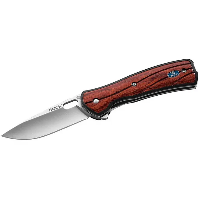 Ein echtes Gentleman Einhandmesser aus dem Hause Buck. Das in den USA gefertigte Model VANTAGE AVID ist mit einer Drop Point Klinge aus rostfreiem 420HC Stahl ausgestattet und kann über einen Flipper oder den Klingendurchbruch in Arbeitsposition gebracht werden. Ein Liner Lock Mechanismus arretiert die Klinge zuverlässig. Das Heft bilden Edelstahlplatinen mit einem Nylonrahmen und schöne Einlagen aus CNC bearbeitetem Rosenholz. Ein Edelstahl Taschenclip kann rechts- wie linksseitig tip up montiert werden.