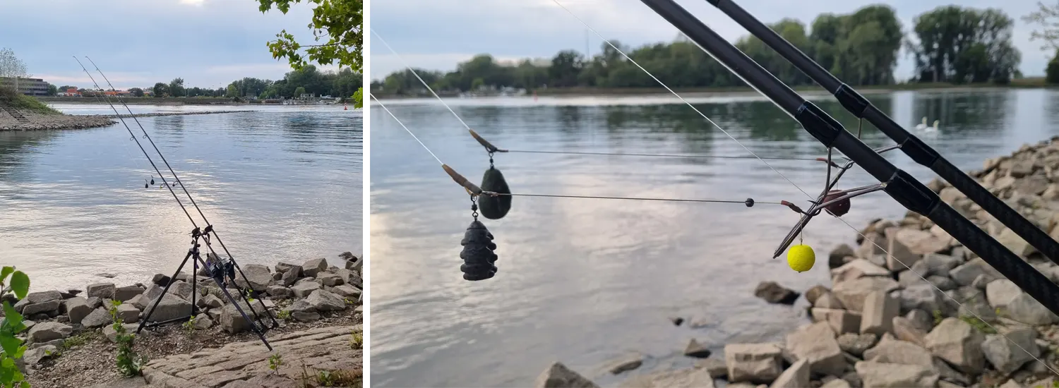 Jetzt aber los - mildes Wetter, leicht steigendes Wasser und ab der zweiten Nachthälfte wurden leichte Gewitter gemeldet. Eine Rute wurde mit einem kleinen Pineapple Pop-Up und die zweite mit einem 22 mm sinkenden Knoblauch Fisch Boilie bestückt. Die Montagen platzierte ich hinter der Steinpackung, dort wo das Kraut endet. Es folgte dann noch etwas Futter auf die Spots und dann hieß es abwarten und wieder das Wasser beobachten.