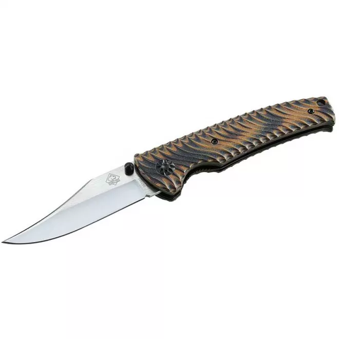 Das handliche Einhandmesser der Marke Puma TEC bietet eine geschwungene Klinge im Clip-Point Stil aus nicht-rostfreiem D2 Carbonstahl. Die beidseitig montierte Schraube erlaubt ein bequemes Öffnen der Klinge, die zum Arbeiten dank Linerlock zuverlässig fixiert wird. G10 Kunststoff kam als Griffbeschalung zum Einsatz. Durch die verschiedenfarbigen Lagen und CNC-Bearbeitung ergibt sich ein dekoratives Schalendesign. Mit Gürtelclip.