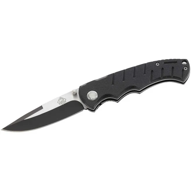 Satten Halt bietet dieses Puma TEC Einhandmesser mit seinen robusten Heftschalen aus geriffeltem G-10 und den ausgeprägten Fingermulden. Die schwarze Teilbeschichtung verleiht der Klinge aus rostfreiem Stahl 420 ein dynamisches Design. Mit beidseitigem Klingenknopf, Liner Lock und Edelstahl-Clip.