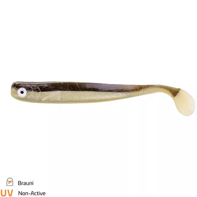 Ein großes Augenmerk sind im wahrsten Sinne des Wortes die auffälligen Augen. Zander sehen besonders hell/dunkel Kontraste gut und diese haltbaren Augen lenken jede Attacke gezielt auf den vorderen Bereich, wo auch der Haken sitzen sollte. Durch seine schlanke Form und dem kleinen Paddel ist der 16er ZANDER Gummi besonders stromschnittig, was besseren Bodenkontakt in der Strömung und größeren Tiefen ermöglicht.